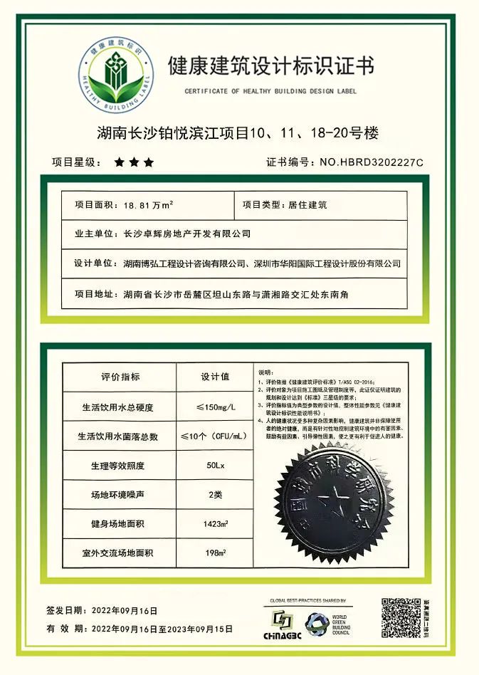 长沙铂悦湘江荣获康健三星修建认证