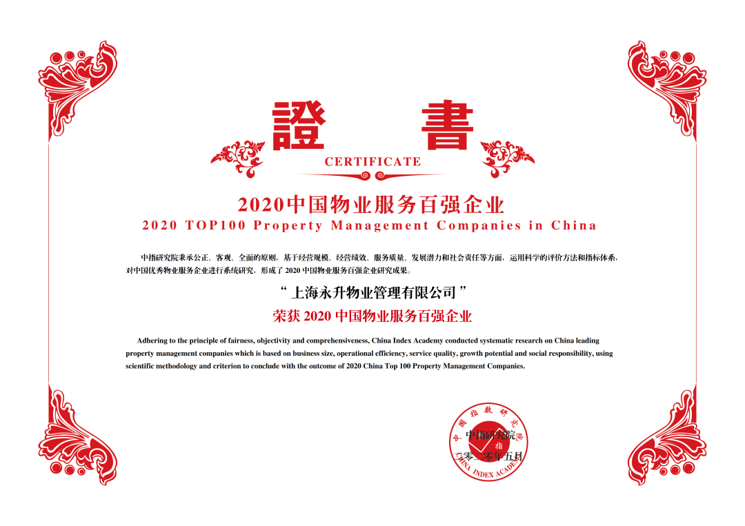永升效劳2020年百强企业声誉证书