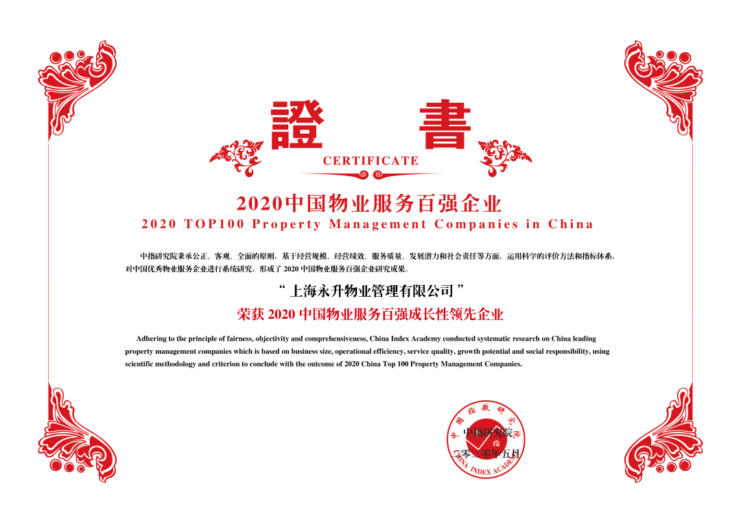 永升效劳2020中国物业效劳百强生长性领先企业